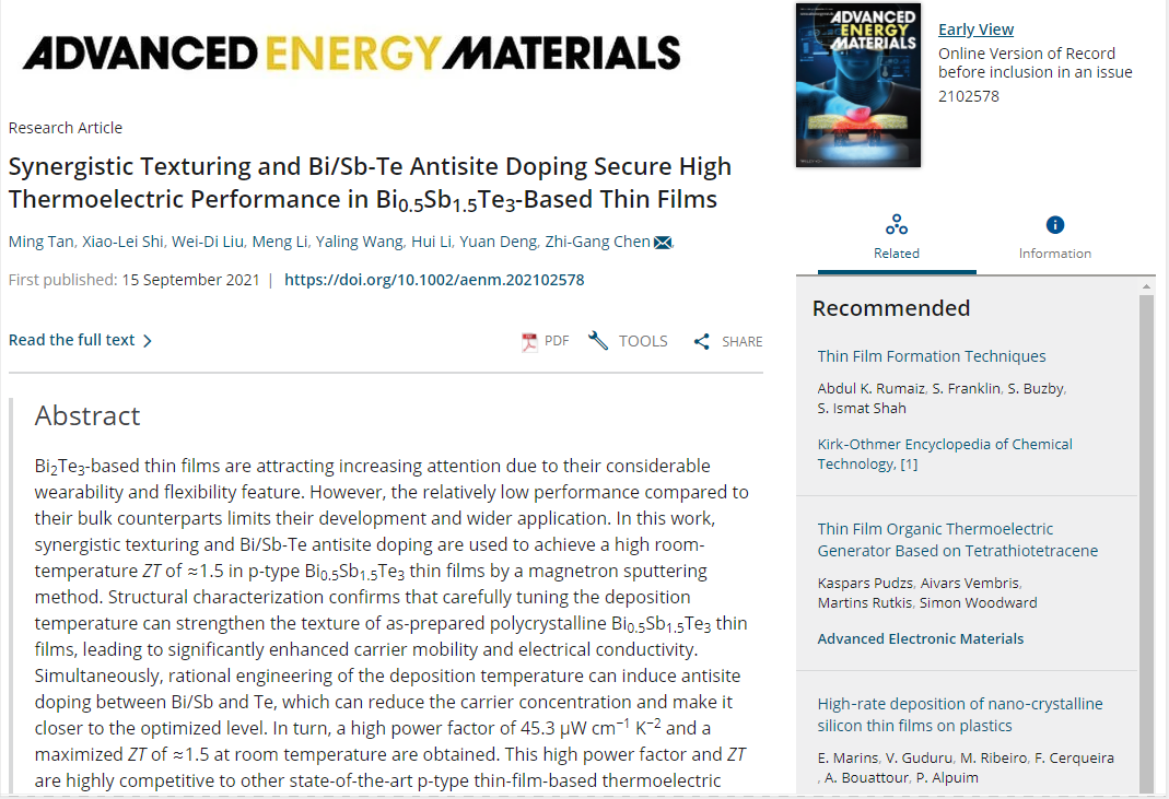 该研究成果以题为“Synergistic texturing and Bi/Sb-Te anti-site doping secure high thermoelectric performance in Bi0.5Sb1.5Te3-based thin films”的研究论文发表在国际能源顶级期刊Advanced Energy Materials上。研究成果主要由谭明教授团队和澳大利亚昆士兰大学、南昆士兰大学的陈志刚教授团队合作取得,北京航空航天大学邓元教授也参与了此项研究工作,起点中文网