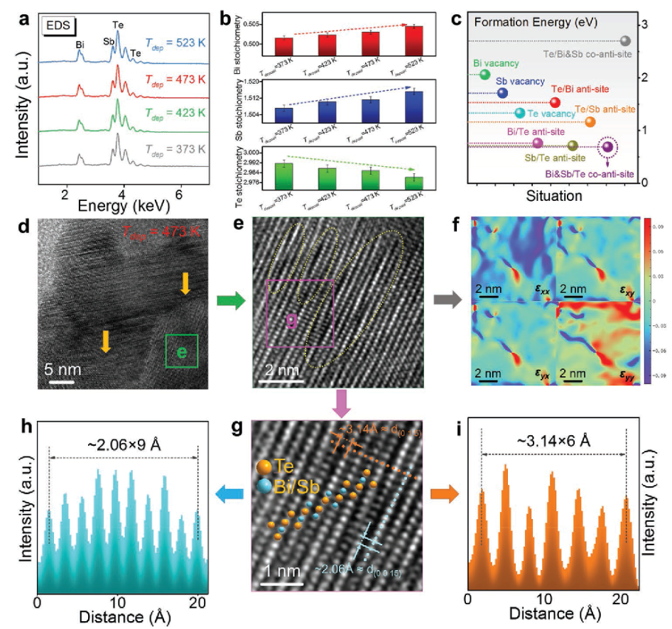 为了解决这个问题,谭明教授团队以Bi-Sb-Te系列为研究对象(如图1所示),进行晶体结构-反位掺杂协同调控,严格调控沉积基底温度,当沉积温度为473K时,制备的Bi0.5Sb1.5Te3薄膜的XRD测试结果表明该晶体沿(0 1 5)面择优定向生长,这为载流子输运提供择优路径,从而提升了载流子迁移率。此外,成分是影响材料性能的另一重要因素,通过计算发现Bi&Sb-Te反位共掺杂形成能最低,即Bi&Sb-Te反位共掺杂容易发生(见图2);经过实验进一步证实了薄膜中存在Bi&Sb-Te反位共掺杂,正是这种反位掺杂可以释放更多的电子,即导致空穴浓度降低,因而使得薄膜的功率因子S2σ大幅提升;另Bi/Sb-Te原子反位掺杂致使载流子有效质量增加,同时促使Bi0.5Sb1.5Te3基半导体的费米面向价带飘移、使其成为高度简并态半导体。综上所述,协同调控了电传输和热传输,实现了zT值净增长,在沉积温度473K制备的p-Bi0.5Sb1.5Te3基薄膜拥有高室温性能zT≈1.5,这比其它的p型半导体薄膜的热电性能都要优异。