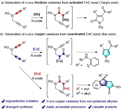 氮杂环化合物广泛存在于药物分子、天然产物和其它重要的生物活性分子中。其中,吡咯环结构是最常见的一类含氮杂环骨架,因此,众多有机化学工作者一直对其合成有着非常浓厚的兴趣。近年来,利用廉价易得的炔烃做为原料,氮氧化合物做为氧化剂,在过渡金属催化下,通过炔烃的氧化,可以高效地构建吡咯环类化合物,该策略中涉及到一类非常重要的卡宾中间体——α羰基金属卡宾中间体。近年来,Zhang、Hashmi、Liu、Tang、张俊良和叶龙武等在炔烃的氧化领域报道了一系列非常重要的研究进展。然而,上述方法中所使用的催化剂还主要局限于贵金属催化剂——金复合物、铑复合物(图1a)。