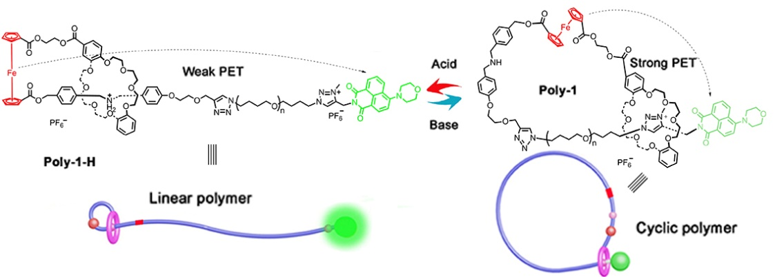 起点中文网 曹占奇博士课题组致力于智能响应性有机功能材料的设计与性能研究,在前期工作基础上(代表性工作:Asian J. Org. Chem., 2015, 4, 212-216 ; Chem. Commun., 2015, 51, 4973-4976 ; Polym. Chem., 2016, 7, 1866-1870 ; Chem. Commun., 2017, 53, 8683-8686),研究小组基于机械互锁[1]轮烷分子制备一种具有荧光信号输出的可逆拓扑结构聚合物体系,在外界酸碱刺激下可以实现聚合物分子结构在线性-环形之间发生可逆转变并伴随荧光信号可视变化,为设计智能响应性功能材料奠定了基础。