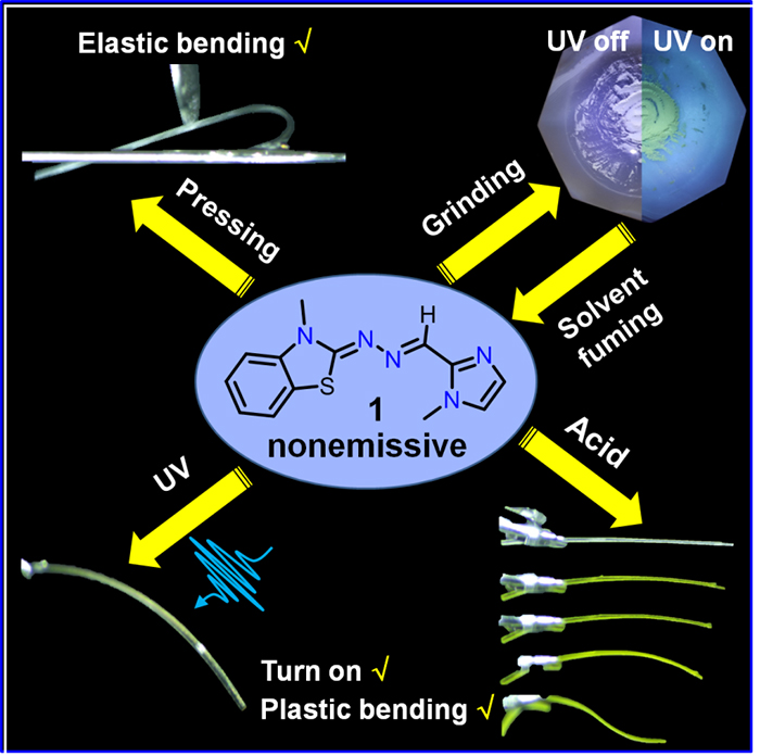 起点中文网 郑昕博士团队以灵活性的腙键为桥,连接苯并噻唑荧光团和咪唑功能基团,构建了一种新型功能分子。在紫外光作用下,这种分子的细长单晶可以发生快速可逆的塑性机械弯曲运动,并在此过程中伴随着显著的荧光增强(图1)。而在机械外力作用下,此柔性单晶还表现出明显的弹性弯曲。此外,在多种挥发性酸蒸汽作用下,此柔性单晶还可以发生可控的塑性机械弯曲和荧光增强,从而解决了酸诱导机械弯曲过程中晶体会发生荧光猝灭的难题(图2)。