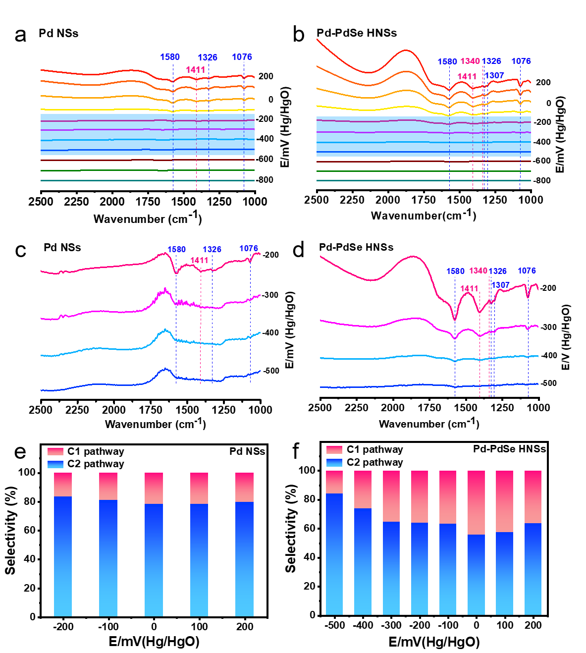 图4. a,c)Pd NSs和 b,d) Pd-PdSe HNSs的电化学原位FTIR光谱;e) Pd NSs和f) Pd-PdSe HNSs在不同电压下的产物分布。