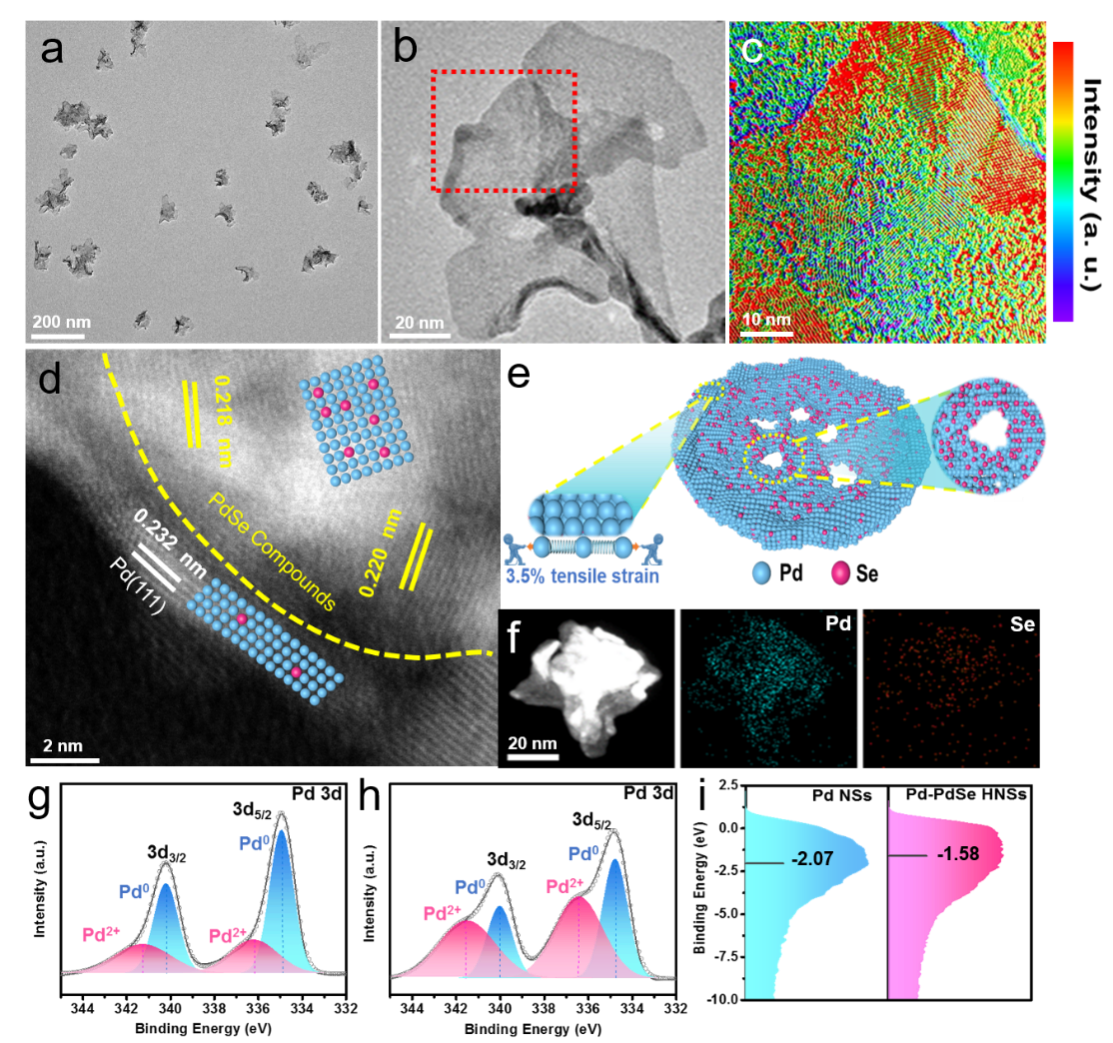 Pd-PdSe HNSs的结构形貌表征如图2所示。通过透射电子显微镜(TEM)和高角度环形暗场扫描透射电镜(HAADF-STEM)图像表明,Pd-PdSe HNSs是典型的二维结构(图2a,2b)。均匀的彩虹彩色图像显示了边缘和内部区域的明显厚度差异,揭示了Pd-PdSe HNSs上独特的红细胞样结构(图2c)。图2d清楚地展示了Pd-PdSe HNSs的边缘和内部存在不同的结晶度,纳米薄片边缘结晶度高,内部结晶性低。与Pd NSs相比,Pd-PdSe HNSs的边缘存在大约3.5%的拉伸应变。内部区域的晶格间距表现出剧烈的波动,该值在0.191~0.236 nm范围内,可以归因于PdSe和Pd4Se等PdSe化合物,从而合理地推断Pd-PdSe HNSs具有异质结构。X射线光电子能谱(XPS)分析表明,Pd-PdSe HNSs中Pd2+的氧化态比例为57.5%,远高于Pd NSs的36.3%(图2g,2h)。此外,利用表面价带光电子能谱对Pd NSs和Pd-PdSe HNSs的d带中心位置进行测定。与Pd NSs相比,Pd-PdSe HNSs d带中心明显上移(图2i),电子结构发生了改变。