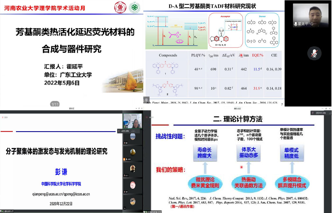 中国科学院大学彭谦教授带来了题为《分子聚集体激发态与发光机制的理论研究》的报告,他介绍一种普适的有机分子激发态过程的速率理论及计算方法,并应用该方法阐明新型有机聚集体的发光机制,例如聚集诱导荧光、聚集诱导热激活延迟荧光、纯有机室温磷光等。同时,基于发光机制,建立有机材料分子结构-性能关系,提出高发光效率的有机发光材料分子的设计策略。