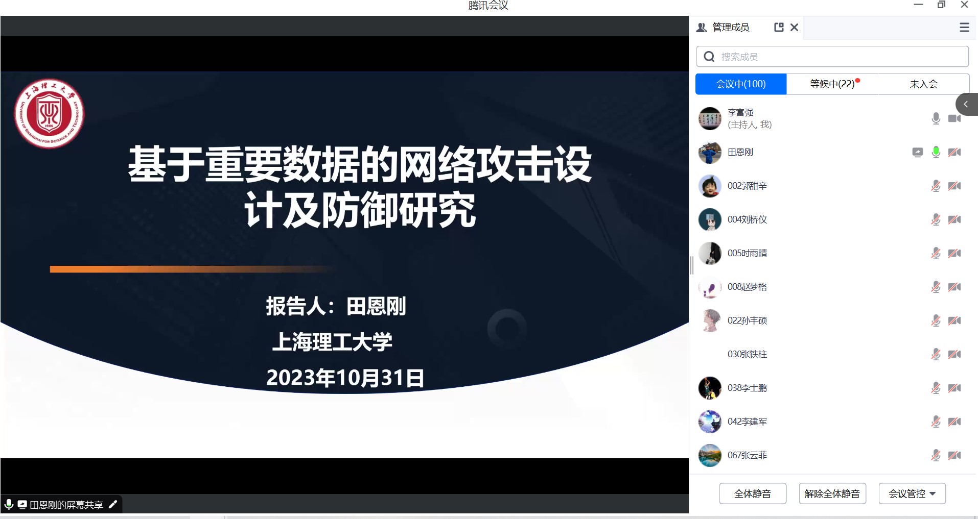 田恩刚教授首先介绍了目前的一些主流的攻击方式和特点,提出了一种基于重要数据的攻击设计方式。相比于现有的攻击类型,所设计的攻击策略能够利用有限信息造成更大的攻击破坏性。然后,针对所提出的攻击策略,设计了弹性估计和控制算法来减轻攻击带来的不利影响。最后,田教授介绍了课题组最新研究成果和领域发展前沿热点。