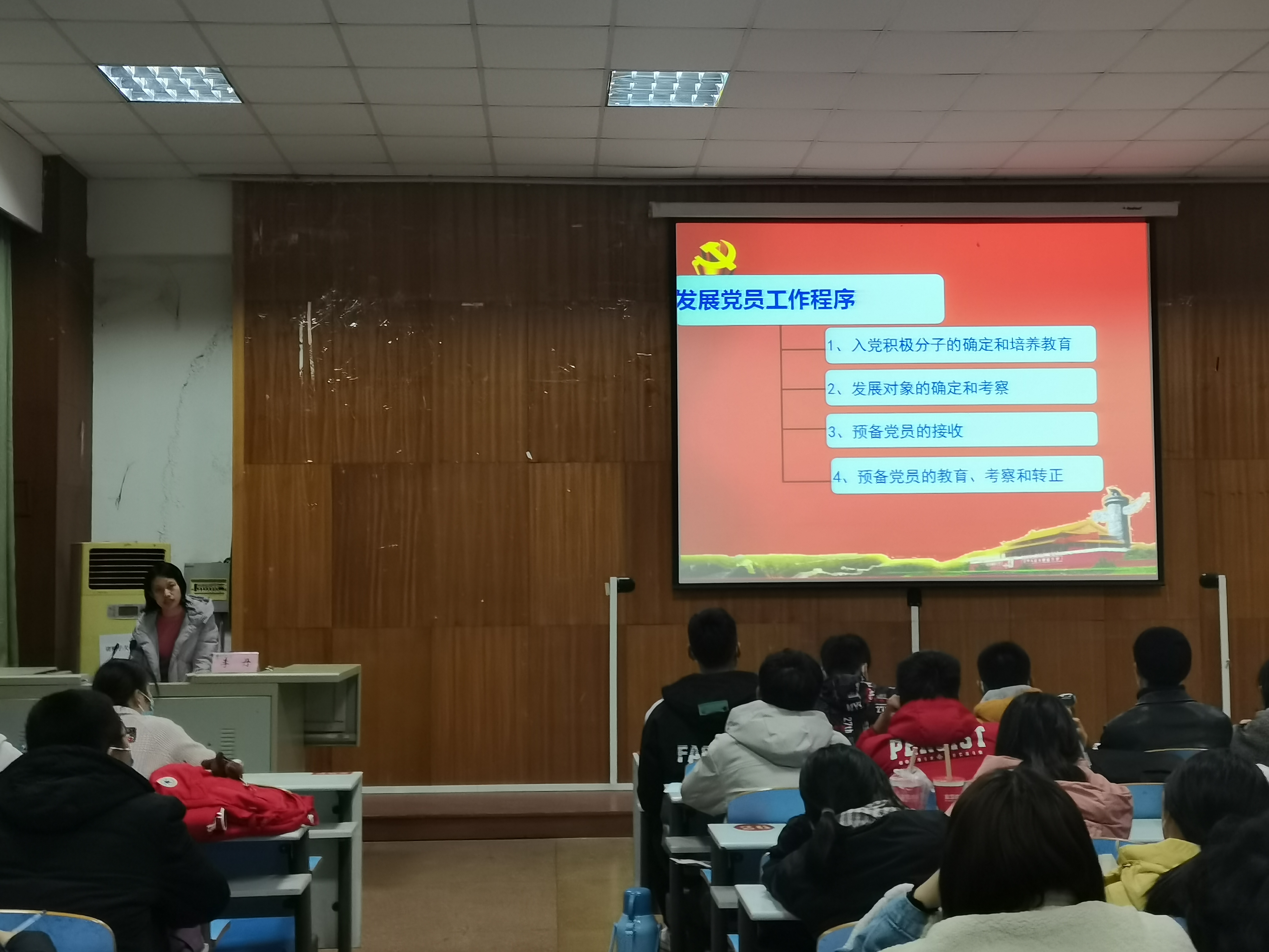 课上,李丹从入党的基本条件、党员的基本要求等方面向现场的入党积极分子详细讲解了成为中国共产党党员的条件。随后,她从发展党员的要求、工作原则,入党积极分子的确定和培养教育,发展对象的确定和考察,预备党员的接收以及预备党员的教育考察和转正等方面,向现场入党积极分子讲述了发展党员的方针和程序。最后,她希望入党积极分子端正入党动机,增强“四个意识”,坚定“四个自信”,积极参加社会实践活动和理论学习,做一个拥有共产主义觉悟的先锋战士。