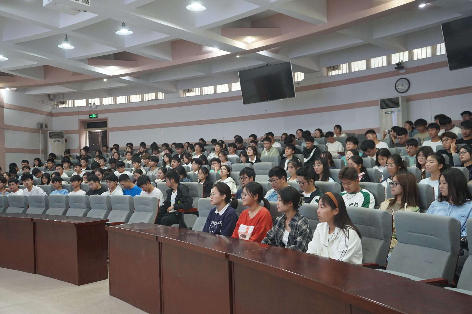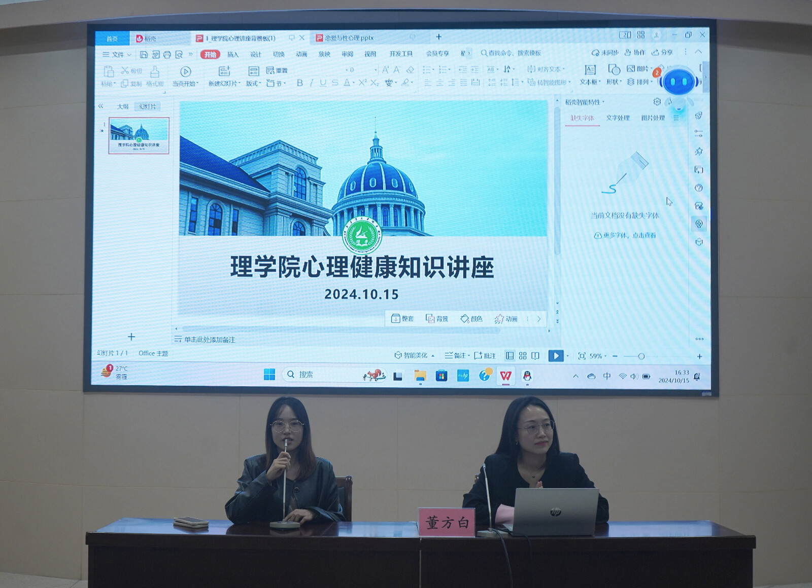 于文化路校区300人报告厅举办了主题为“大学生恋爱与性健康”的心理健康知识讲座,本次讲座特邀我校心理健康中心主任董方白担任主讲嘉宾,24级辅导员付欠丽出席讲座,24级全体学生参与讲座。