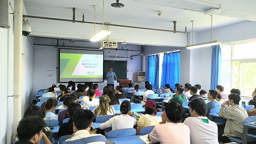 21级应化专业学生做了关于“植物生长调节剂的现状与发展趋势”的讲座,他结合工作经历和公司实践,生动地向同学们讲解了植调剂的概念、分类、作用机制、市场应用和发展趋势,还赠送了专业书籍,并鼓励同学们积极追踪技术前沿、勇于科技创新、学好专业知识,为国家经济建设和科技发展贡献力量。
